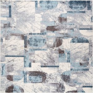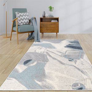 Abstract Rustic Minimalist Contemporary Rug – Modern Carpet for Living Room, Bedroom, Office, Entrance, and Hallway – Blue, Grey, and Ivory