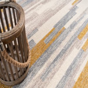 : This rug is designed with a abstract pattern with neutral colors like mustard yellow, grey, and beige that features rustic minimalistic vibe with a distressed finish. This combination makes this rug simple and sophisticated.